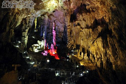 进入洞口,顺着人行长廊前行,步入绚丽多彩的神话世界呈现眼前的是层层叠叠的石花,和成排成队的石笋。它们完全靠岩壁上渗漏出的水一滴一滴,经过天长日久而形成各类沉积物所构成的洞内景观,既玲珑剔透,又辉煌壮观大小不一,形态各异的石幔、石笋,就像巧夺天工的艺术品亦真亦幻,五彩斑斓辉煌宏大的地下艺术宫殿,置身于此,顿觉神魂镇摄,敬畏丛生!