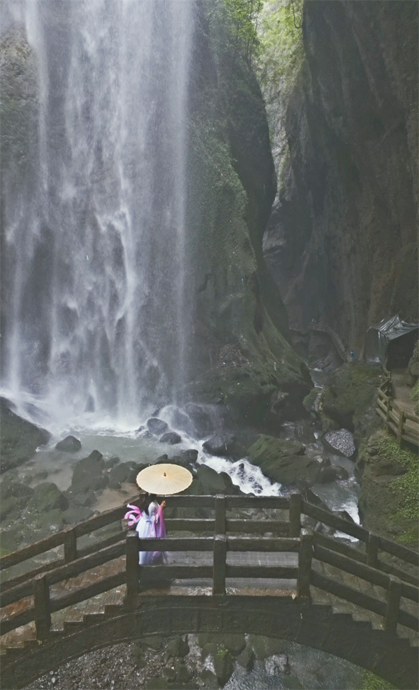 随后深入龙水峡地缝,沿栈道下行,洞瀑飞泻,藤蔓垂悬。阳光从缝顶洒落,水汽氤氲,光影交织。