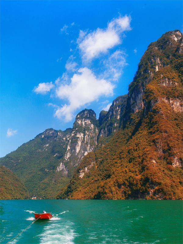 随后探访芙蓉江,乘舟行于碧波之上,两岸绝壁叠翠,秋色浸染,倒影成画。