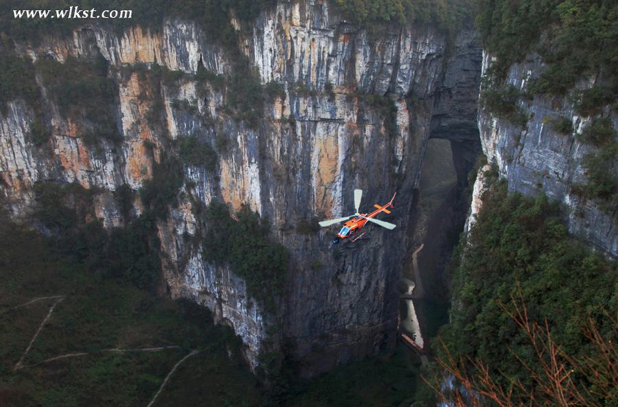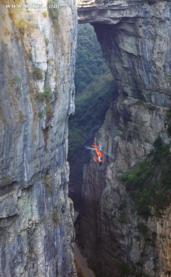 航拍拍摄了天生三硚的天龙天坑、神鹰天坑,此次航拍拍摄难度系数非常高,全速低空飞行穿越了天龙桥和青龙桥两个桥洞,螺旋桨距岩壁最近距离仅三米。