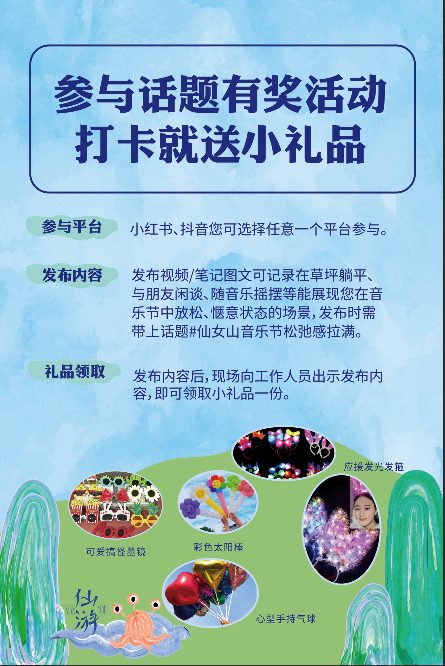 发布带话题仙女山音乐节松弛感拉满的笔记/视频,即可到现场领取小礼品一份。