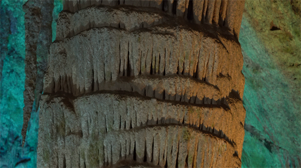 石笋表面布满类似棕榈树皮的放射状纹路,这是“飞溅水沉积”的典型标志。当水滴从高处溅落,水花带出的钙质以中心向外扩散结晶,形成了如塔檐层叠、斗拱支撑一般的精细结构。这是纯粹物理过程创造的意外之“精致”。