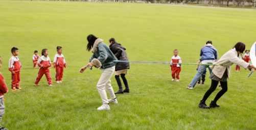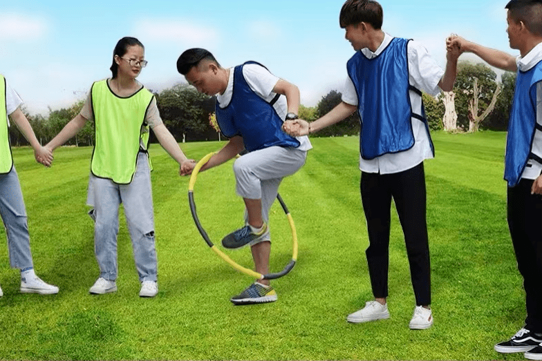 一圈到底:5个家庭组队手拉手,将圆环从第一人传到最后一人(手不能松),在欢声笑语中感受团队协作的快乐。