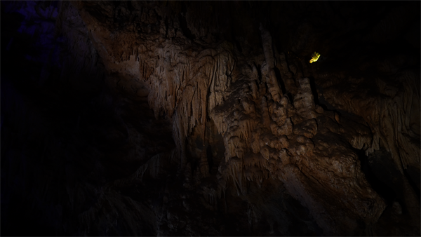 看那被暖黄灯光点亮的奇妙景观:从洞顶向下生长的是石钟乳,自地面向上攀升的是石笋。当它们遥相对望,仿佛天地间一场静默的对话,称之为“千年之吻”。